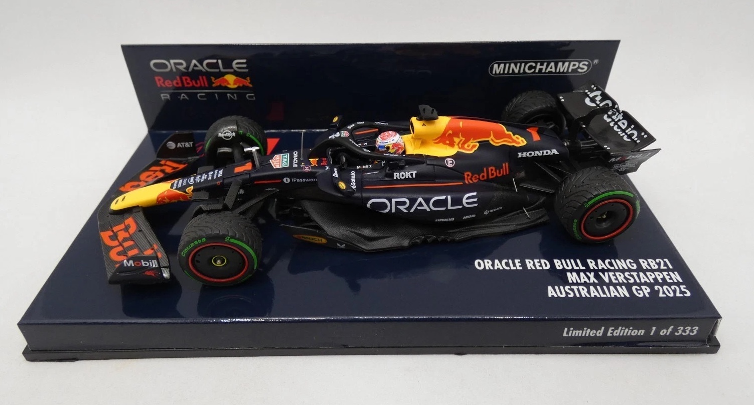 Minichamps (417250101) Echelle : 1/43 |  | Modèle : RedBull RB21 Honda RBPT Année : 2025 Pilote : Max Verstappen  Version : Australian GP Ed. limitée : 333 ex.