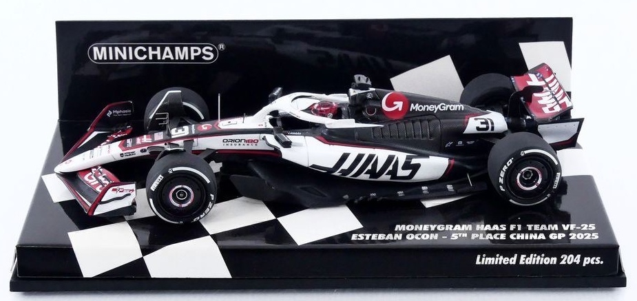 Minichamps (417250231) Echelle : 1/43 |  | Modèle : Haas VF-25 Ferrari Année : 2025 Pilote : Esteban Ocon  Version : 5th place China GP Ed. limitée : 204 ex.