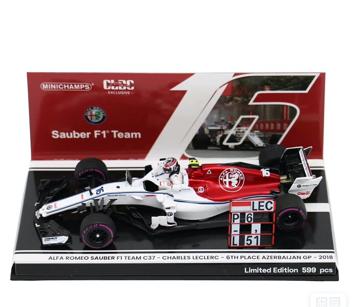 Minichamps (4471804016) Echelle : 1/43 |  | Modèle : Sauber C37 Ferrari Année : 2018 Pilote : Charles Leclerc  Version : 6th place Azerbaijan GP Ed. limitée : 599 ex. Collection : CLDC Exclusive Collection |