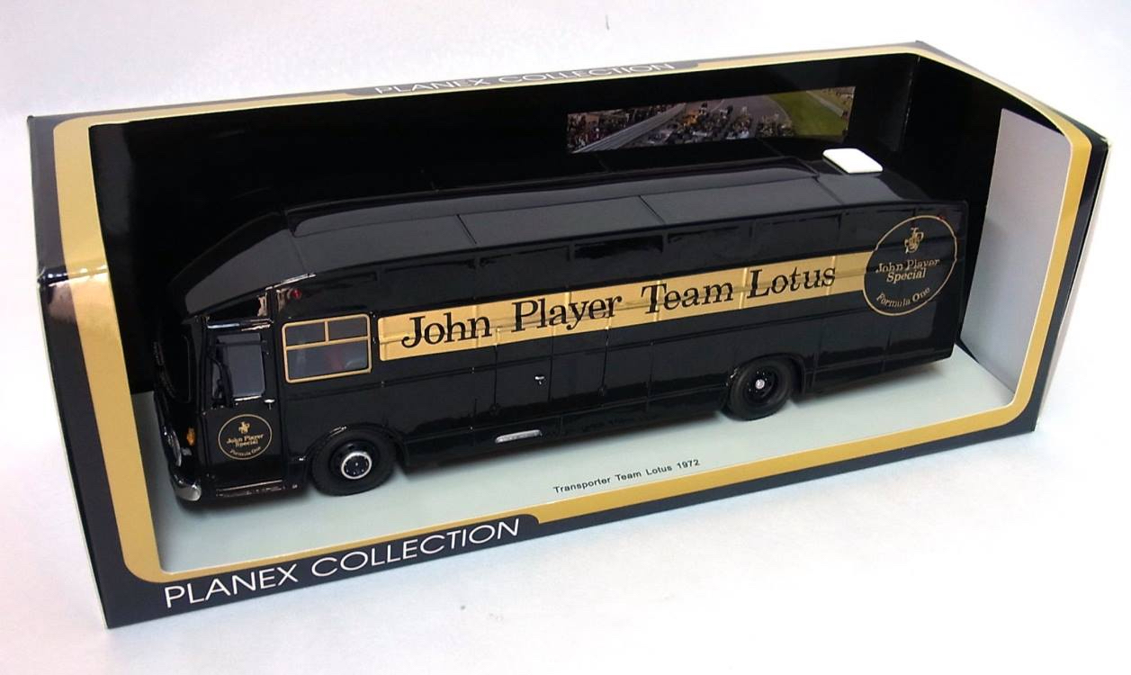 Spark (LOT-SPK-JPS-TP) Echelle : 1/43 |  | Modèle : Lotus AEC Swift Ford Cosworth Année : 1972 Pilote : Emerson Fittipaldi / Dave Walker  Version : Transporter Team Lotus Collection : Planex Collection |