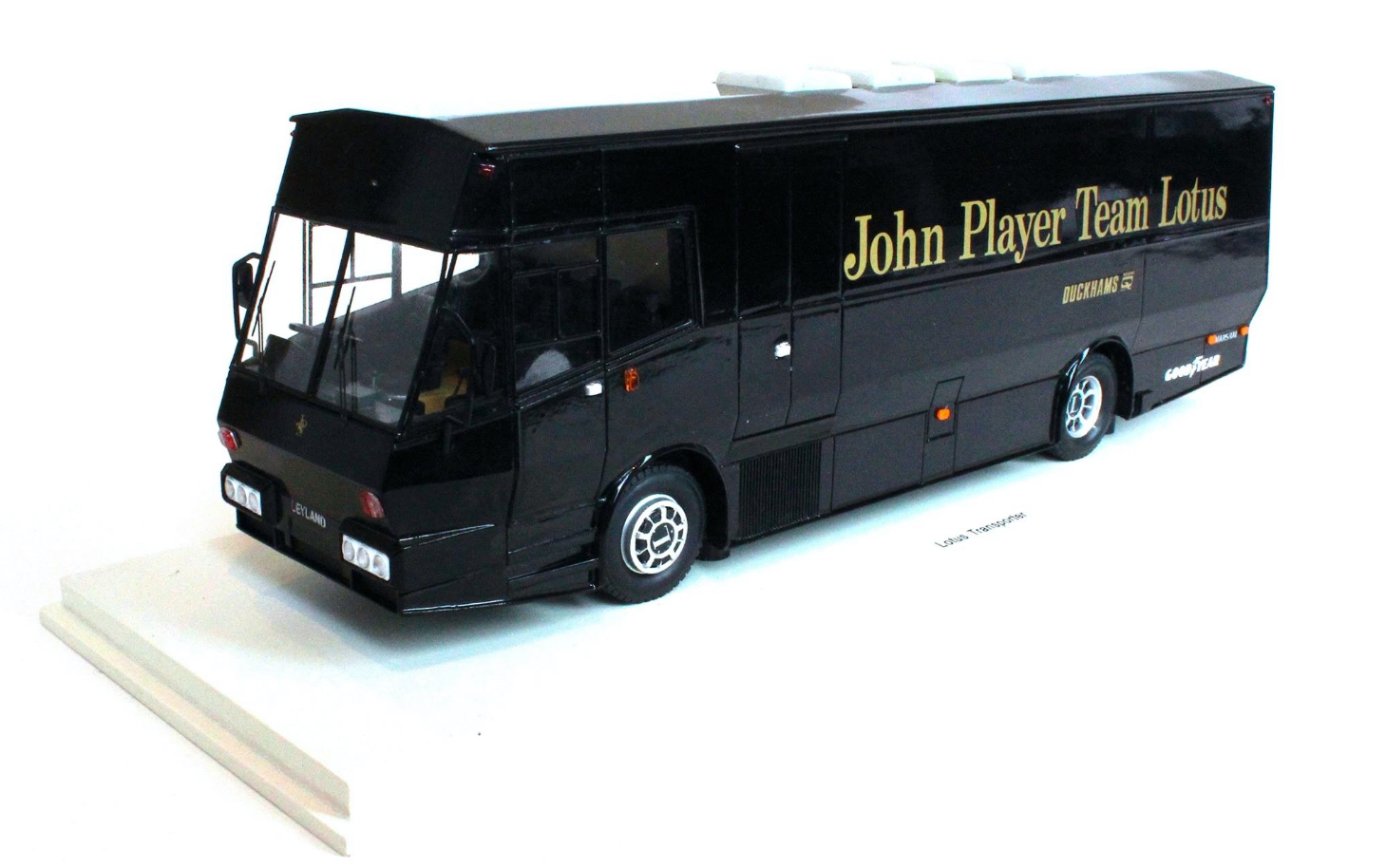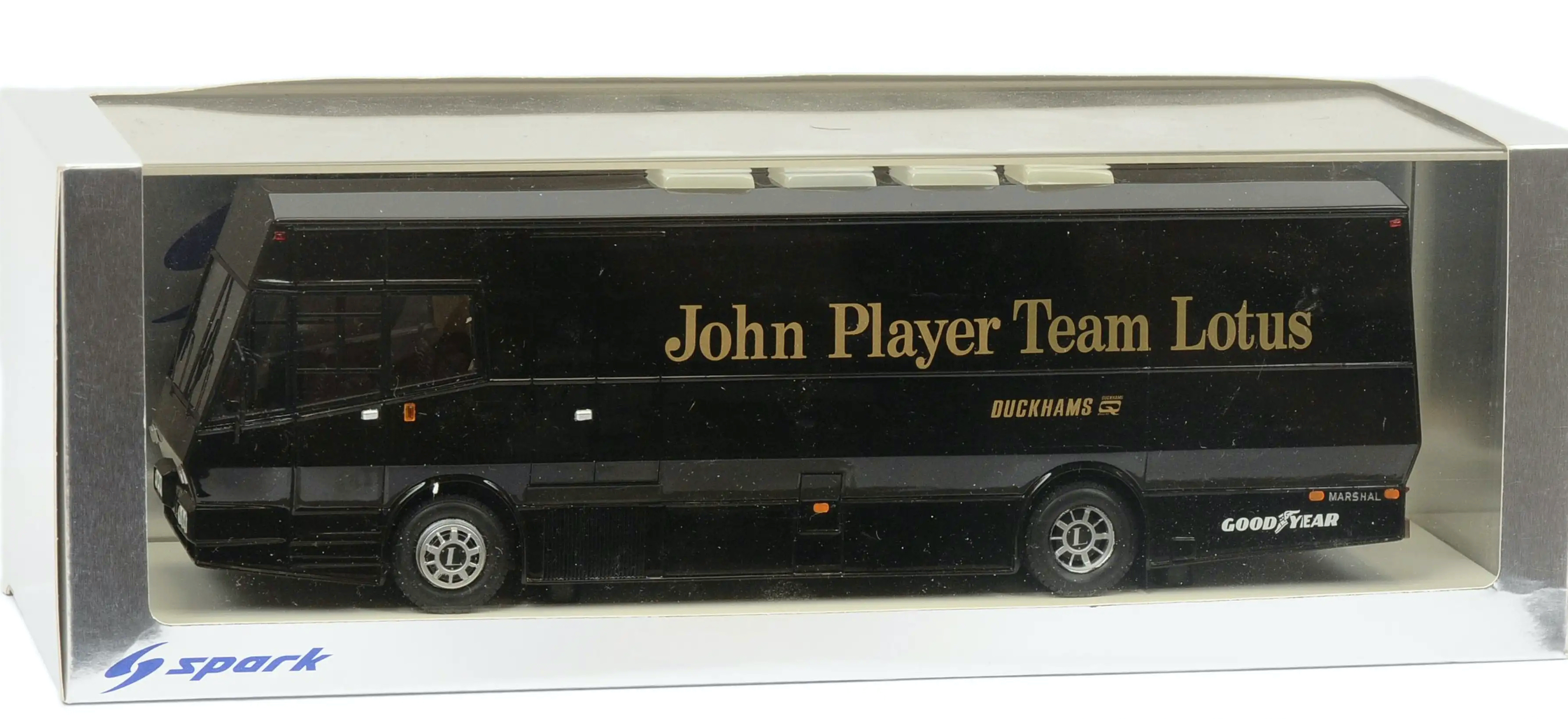 Spark (S0280) Echelle : 1/43 |  | Modèle : Lotus Dodge Travco Ford Cosworth Année : 1973 Pilote : Ronnie Peterson / Emerson Fittipaldi  Version : JPS Team Lotus