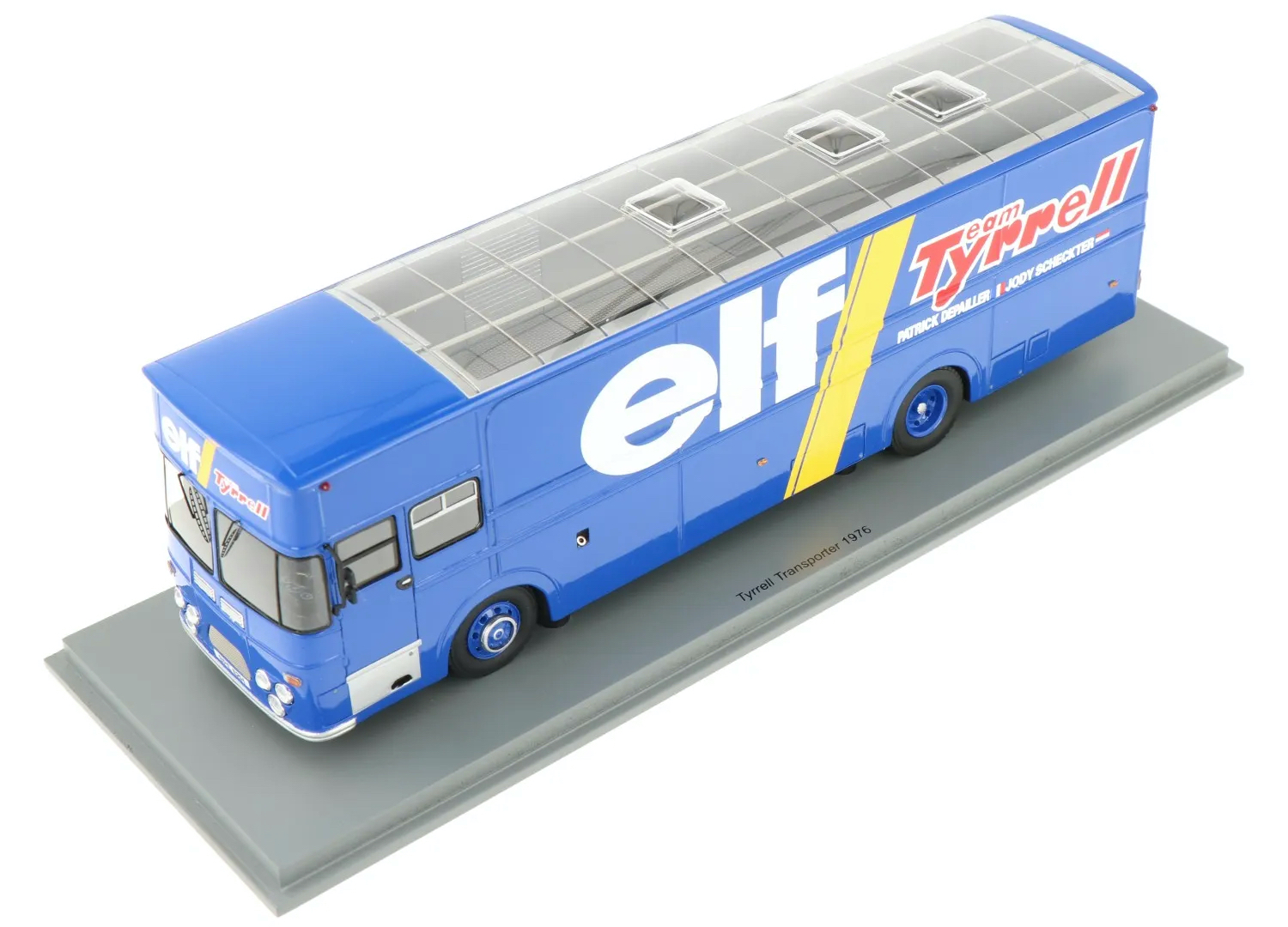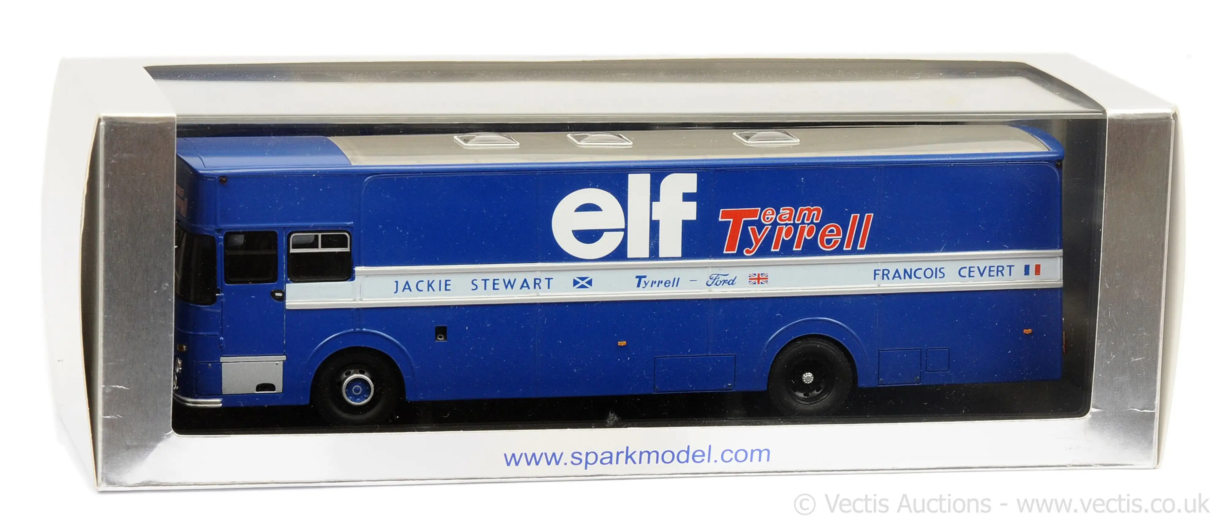 Spark (S0296) Echelle : 1/43 |  | Modèle : Tyrrell Leyland truck Ford Cosworth Année : 1970 Pilote : Jackie Stewart / François Cevert  Version : Elf Team Tyrrell