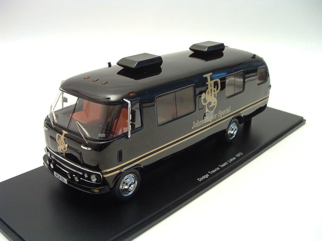 Spark (S0280) Echelle : 1/43 |  | Modèle : Lotus Dodge Travco Ford Cosworth Année : 1973 Pilote : Ronnie Peterson / Emerson Fittipaldi  Version : JPS Team Lotus