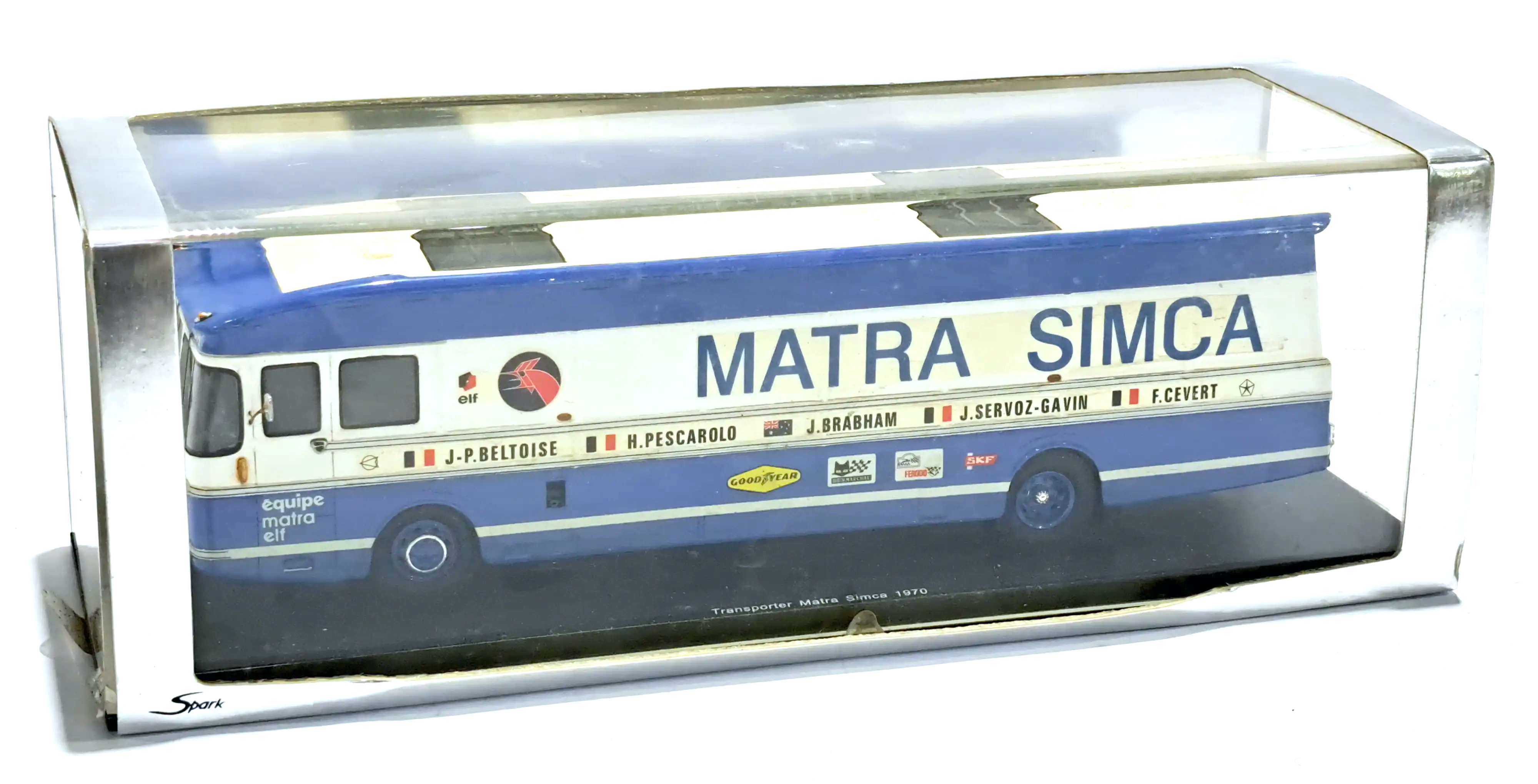 Spark (S0291) Echelle : 1/43 |  | Modèle : Matra Leyland truck Matra Année : 1970 Pilote : Jean Pierre Beltoise / Henri Pescarolo  Version : Matra Simca