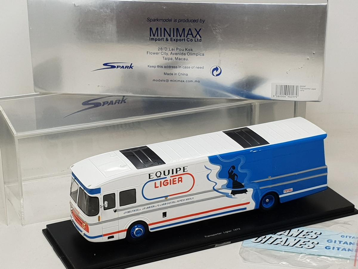 Spark (S0297) Echelle : 1/43 |  | Modèle : Ligier Leyland truck Matra Année : 1975 Pilote : Jean Pierre Beltoise / Jean-Pierre Jarier  Version : Ligier Gitanes