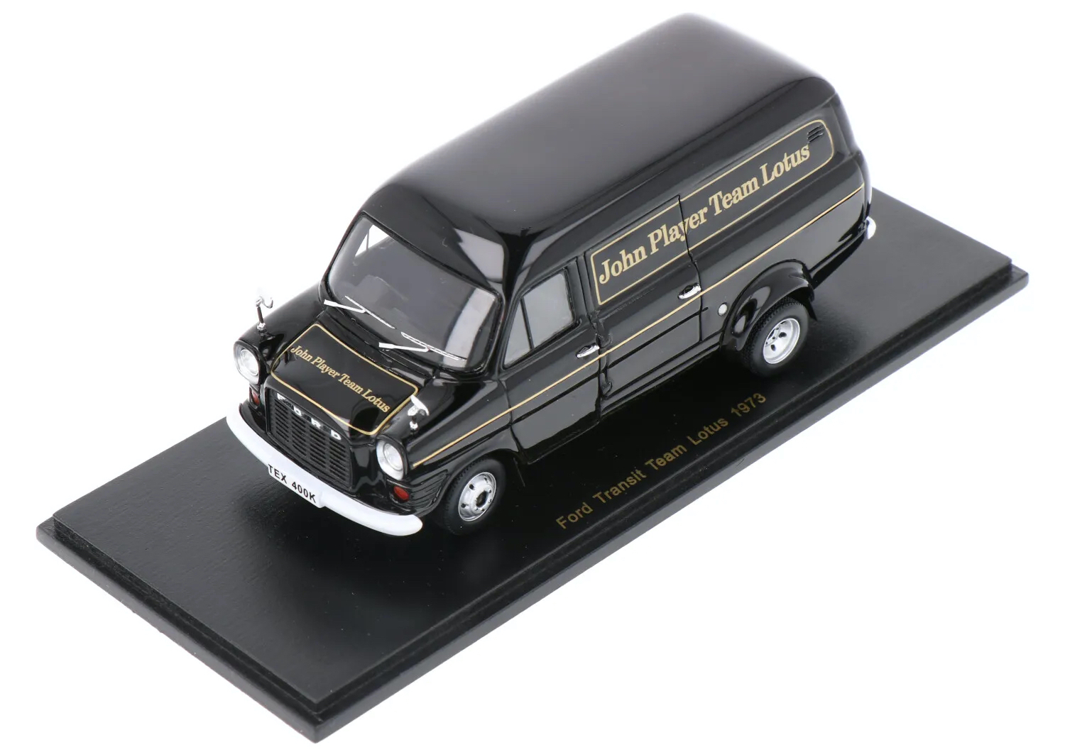 Spark (S2697) Echelle : 1/43 |  | Modèle : Lotus Ford Transit Ford Cosworth Année : 1973 Pilote : Emerson Fittipaldi / Ronnie Peterson  Version : JPS Team Lotus